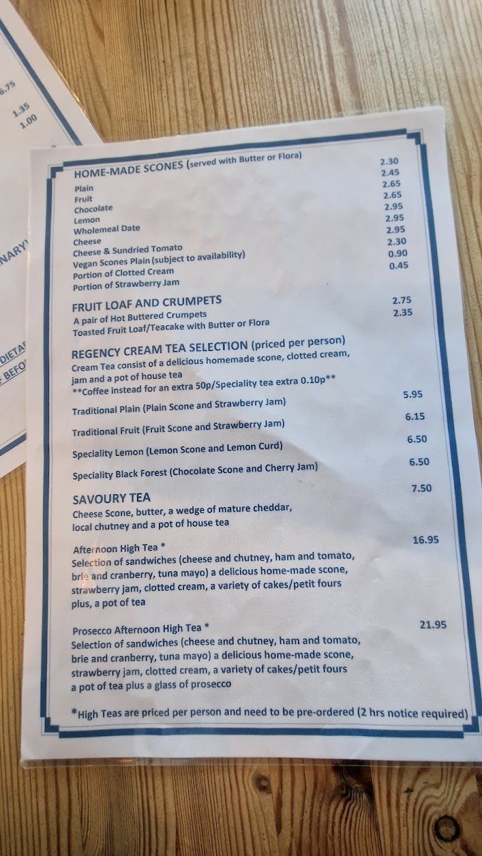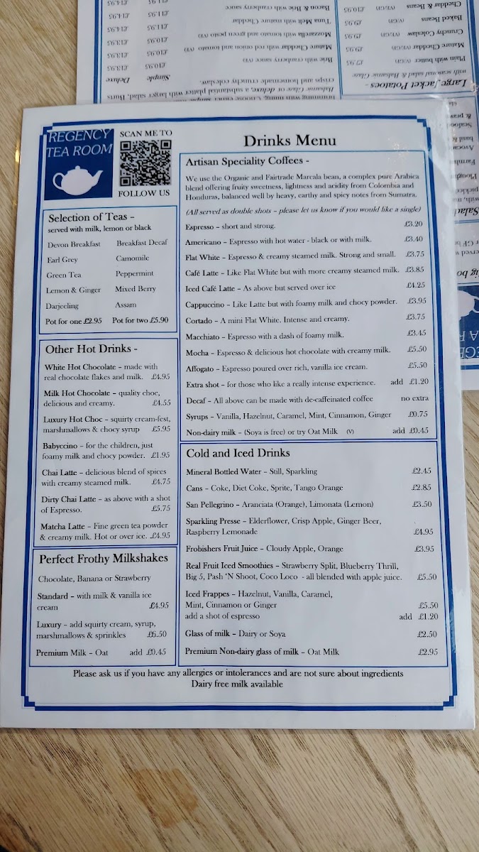 The menu at Regency Tea Room offers a delightful selection of dishes suitable for any time of the day. For drinks, guests can enjoy a variety of specialty teas, rich coffee, or a luxury hot chocolate in either milk or white chocolate. Cold drinks and milkshakes are also available to quench your thirst. For a sweet treat, the tea room boasts a wide selection of cakes and tray bakes, perfect for pairing with a cup of tea or coffee. Those visiting for breakfast can indulge in the Regency Breakfast or the Vegetarian Breakfast, with options like Beans on Toast and Eggs on Toast available for a lighter start. A quick snack or lunch can be enjoyed with options like a Jacket Potato, Fish Finger Bap, or a Panini or Toasted Sandwich. The daily specials offer something new for guests, and a variety of sandwiches are always on hand. The array of dishes provides something for every taste, making Regency Tea Room a cozy spot for any occasion.
