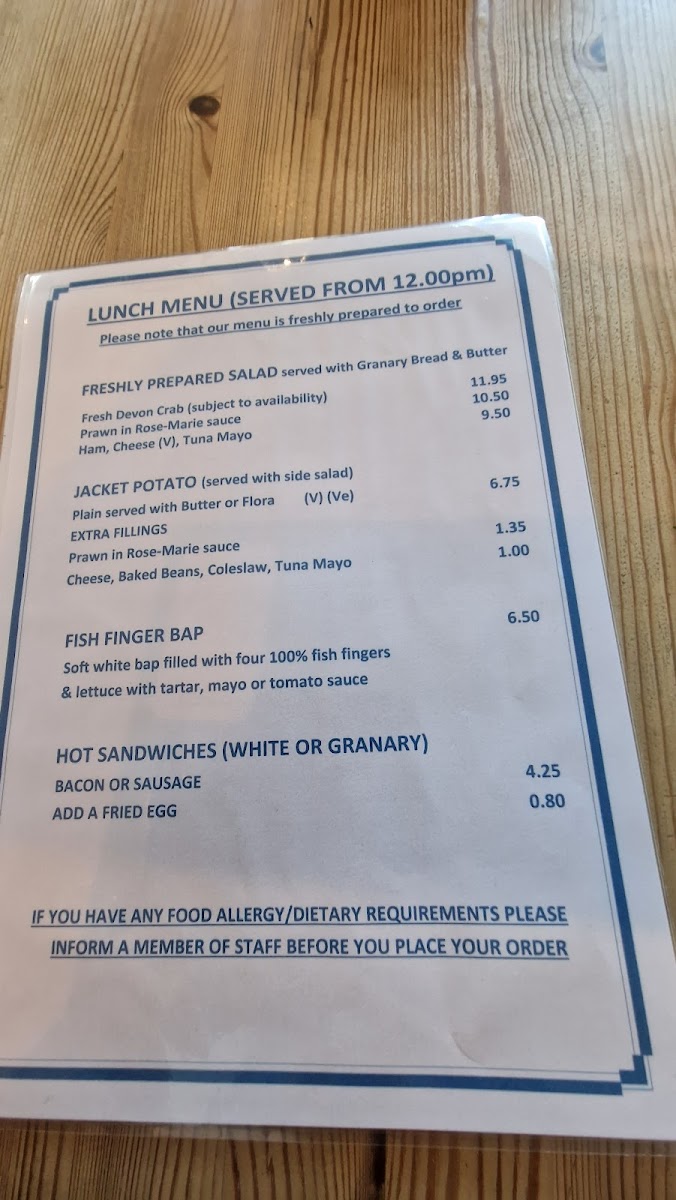 Selection of sandwiches (Granary, White or Gluten Free Bread) various fillings, Brixham Crab, Prawn, Tuna Mayo & Red onion, Cheese and Devon Chutney, Devon Ham & Tomato (Vegetarian/Vegan options available)